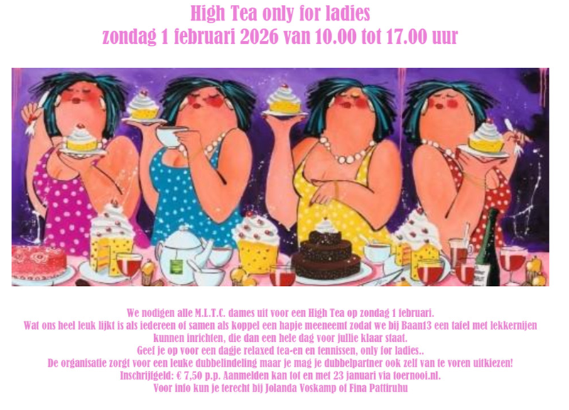 Graag nodigen we alle M.L.T.C. dames uit voor een High Tea op zondag 1 februari 2026. Het lijkts heel leuk als iedereen of samen als koppel een hapje meeneemt zodat we bij Baan13 een tafel met lekkernijen kunnen inrichten die dan een hele dag voor jullie klaar staat.