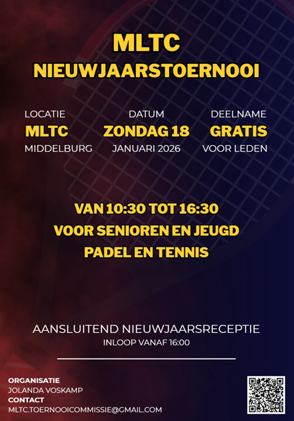 Sportief het nieuwe jaar in, met korte tennis en/of padelwedstrijdjes, voor alle mltc-leden: van ‘jong tot oud’, padel en/of tennis, alle speelniveaus. Je kunt kiezen voor tennis, padel of tennis&padel. Deelname is gratis en voor informatie kan je terecht bij Jolanda Voskamp.